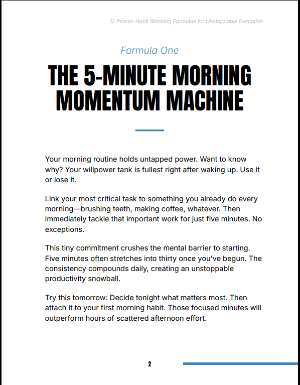 12 Proven Habit Stacking Formulas for Unstoppable Execution is a structured execution system built for people who are tired of starting and stopping. Instead of relying on motivation, this guide shows you how to engineer consistency by linking new actions to habits you already perform daily. The result? Reliable execution, even on low-energy days.