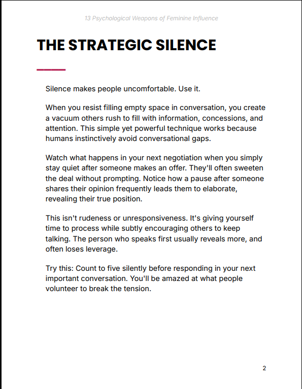 Most people rely on effort, persuasion, or authority to influence others. This creates resistance. 13 Psychological Weapons of Feminine Influence focuses on subtle psychological alignment — understanding how people naturally respond, and positioning yourself in a way that invites cooperation, attention, and respect without friction.