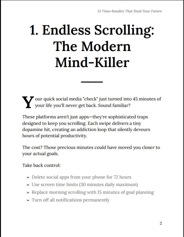 Most productivity advice focuses on doing more. 13 Time-Bandits That Steal Your Future focuses on removing what’s secretly holding you back. By eliminating hidden time leaks instead of adding more tasks, you create immediate clarity, regain control, and free up time for what truly matters.