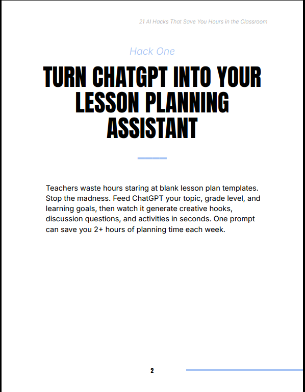AI is already reshaping education — and students are adopting it fast. Teachers who don’t adapt risk falling behind. 21 AI Hacks That Save You Hours in the Classroom focuses on practical, real-world use — helping you reduce repetitive work, increase efficiency, and focus more on teaching instead of admin tasks.