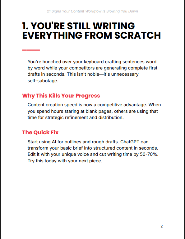 21 Signs Your Content Workflow Is Slowing You Down is a sharp, reality-check guide that exposes the hidden inefficiencies draining your content production—and shows you exactly how to fix them using simple, practical AI-powered workflows. Perfect for creators, entrepreneurs, and marketers ready to move faster and produce smarter.