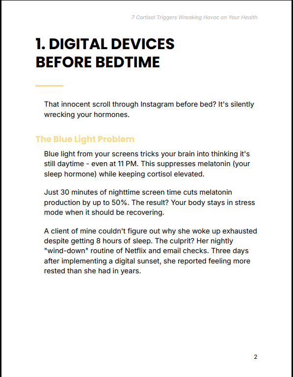Most people try to manage stress by adding more habits — but without addressing the root triggers, cortisol remains elevated. This guide focuses on elimination and correction, helping you remove hidden stressors and replace them with simple, effective systems that your body can sustain long-term.