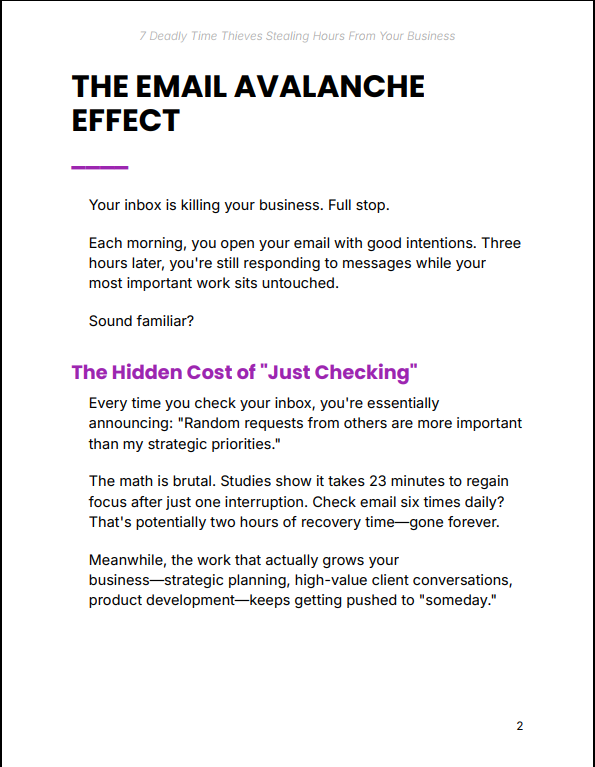 7 Deadly Time Thieves Stealing Hours From Your Business is a direct, strategy-focused guide designed to help entrepreneurs eliminate hidden inefficiencies and regain control of their time. Instead of working longer hours, this book shows you how to identify what’s silently draining your productivity and replace it with systems that drive real business growth.