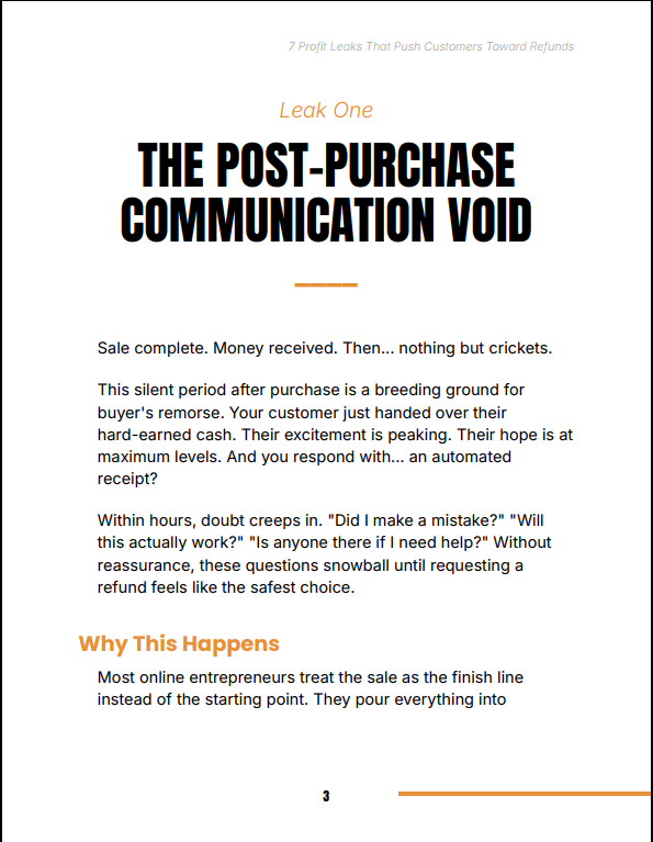 7 Profit Leaks That Push Customers Toward Refunds reveals why customers who were excited enough to buy suddenly disappear, disengage, or request refunds. Instead of blaming product quality, this guide uncovers the real issue — broken post-purchase experiences. With practical fixes and clear frameworks, you’ll learn how to create a smooth, trust-building journey that keeps customers satisfied and committed.