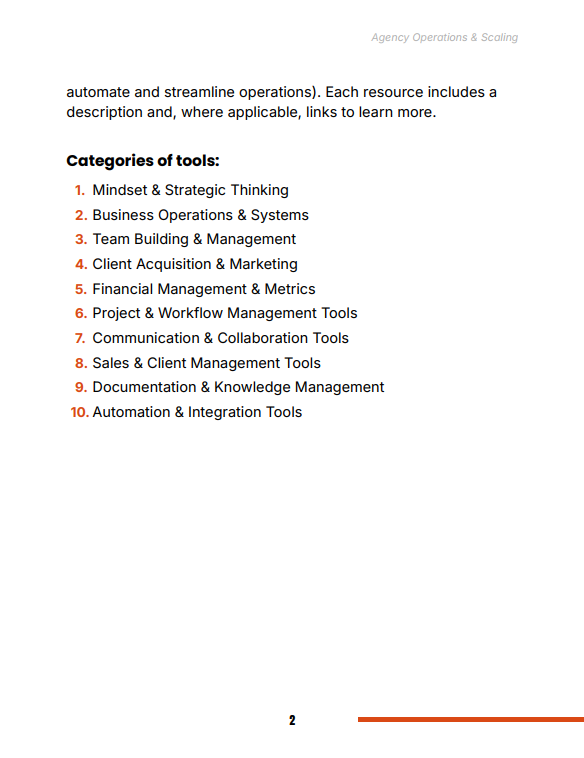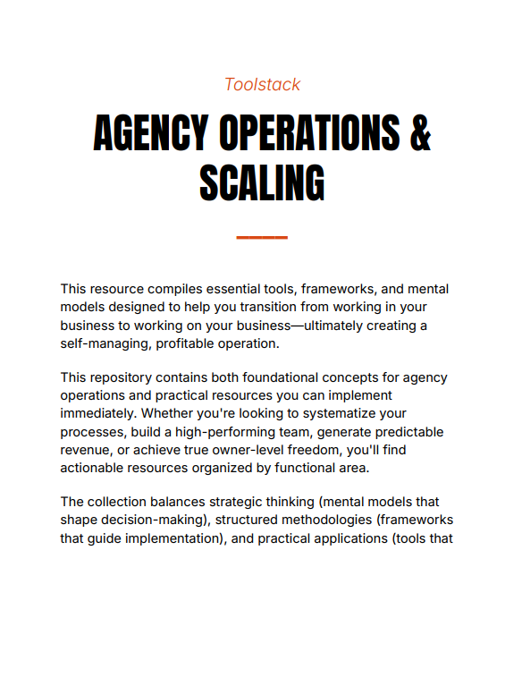 Agency Operations & Scaling Toolstack is a comprehensive, implementation-focused resource designed for agency owners ready to scale beyond freelancer-level operations. It provides a structured system for building a predictable, efficient, and self-sustaining agency by combining strategic thinking, operational frameworks, and practical tools.