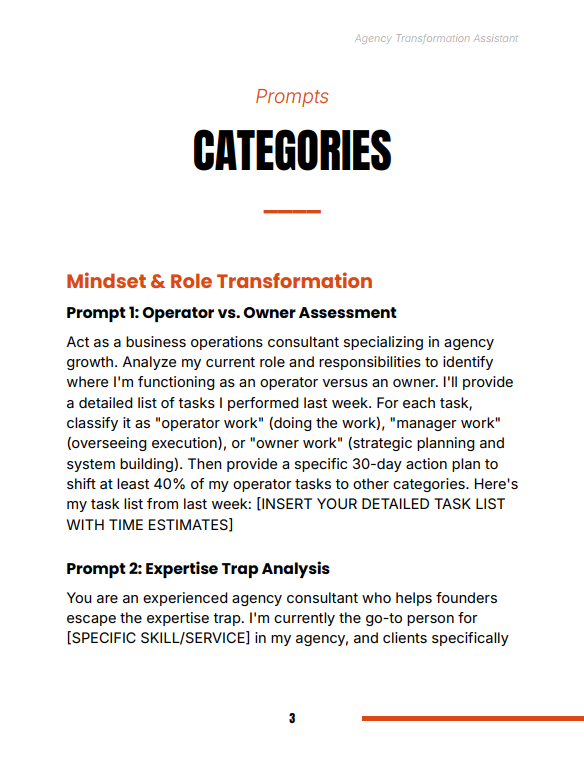Most agency owners stay stuck because they rely on inconsistent effort and mental overload. Agency Transformation Assistant Prompts removes that friction by turning AI into your strategic partner—helping you think clearly, make decisions faster, and implement systems that compound over time.
