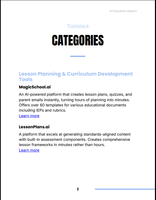 AI Education Helpers Toolstack equips educators with a powerful ecosystem of AI tools and frameworks to transform how teaching is done. From automating lesson planning to delivering personalized student experiences, this resource helps you reduce workload while increasing teaching effectiveness. Designed for practical use, every tool and concept is selected for real-world application.