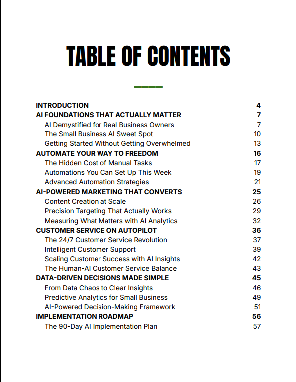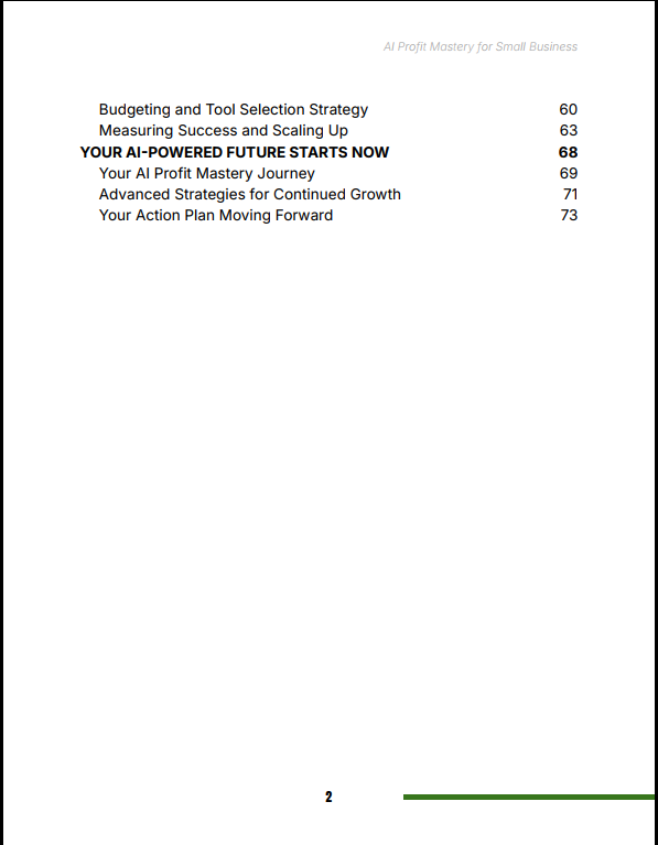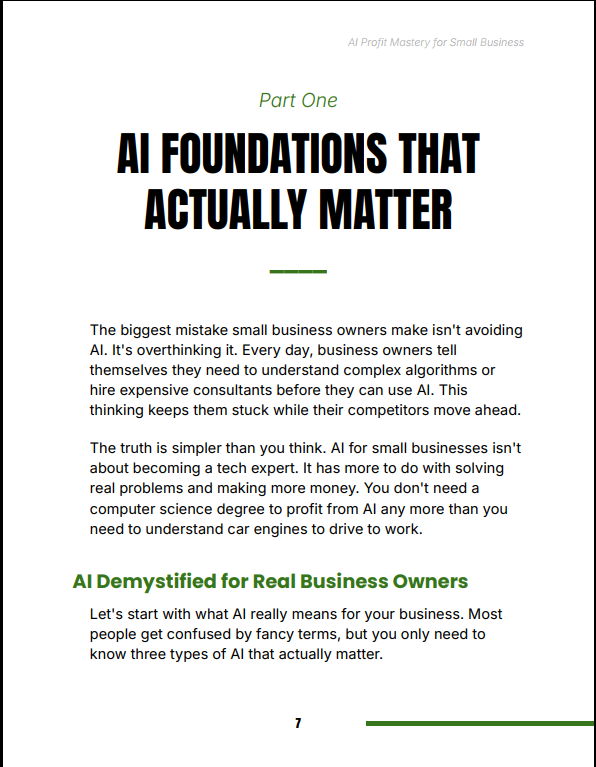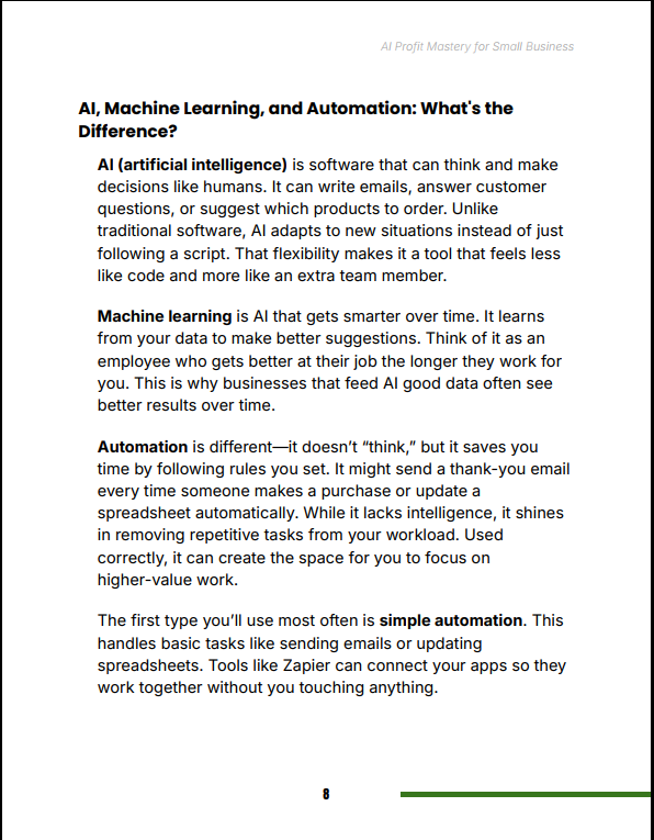 Most AI content is either too technical or too vague. AI Profit Mastery for Small Business bridges that gap by focusing on practical application. It shows you exactly where AI creates the highest ROI in a small business—automation, marketing, customer service, and decision-making—and gives you clear steps to implement immediately.