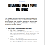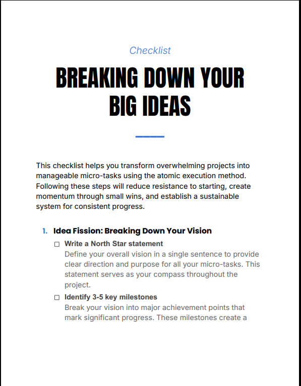 Breaking Down Your Big Ideas Checklist gives you a structured, repeatable system to turn overwhelming ideas into clear, executable steps. Built on the atomic execution method, this checklist helps you reduce cognitive overload, eliminate hesitation, and take immediate action—no matter how big the project feels.