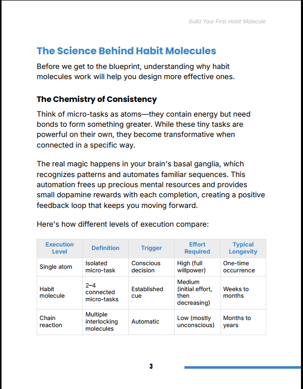 Build Your First Habit Molecule Guide introduces a smarter way to get things done by structuring your tasks into connected sequences that naturally flow. Instead of fighting procrastination with willpower, this guide shows you how to design small chains of actions that trigger each other—creating momentum that feels almost automatic. Using a simple 5-step system, you’ll build your first habit molecule and start executing with less effort and more consistency.