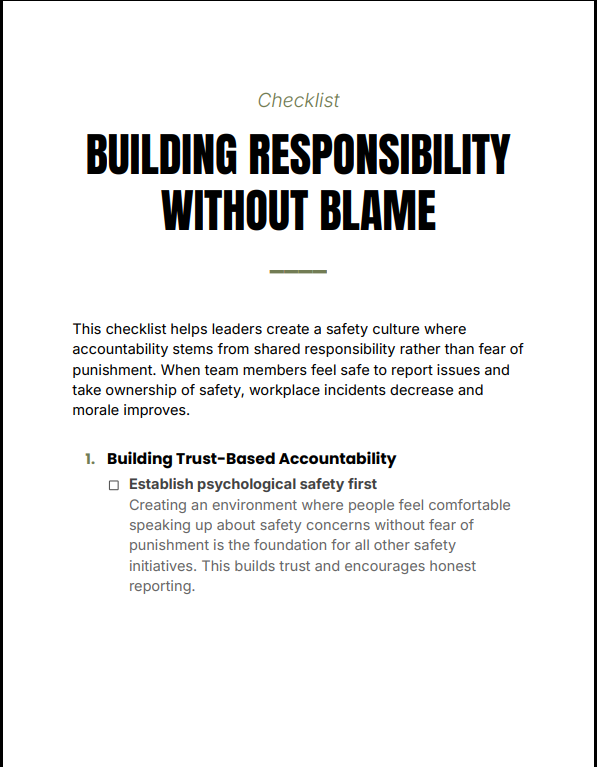 Building Responsibility Without Blame Checklist equips leaders with a clear, actionable system to build a culture of accountability rooted in trust—not fear. Instead of reactive blame, this checklist helps you proactively create environments where team members feel safe to report issues, take ownership, and contribute to continuous safety improvements.