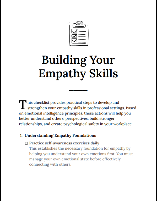 Many professionals struggle with communication not because of lack of knowledge, but lack of understanding. Building Your Empathy Skills Checklist focuses on practical, repeatable behaviors that improve how you listen, respond, and connect—helping you reduce misunderstandings and build stronger, trust-based relationships at work.