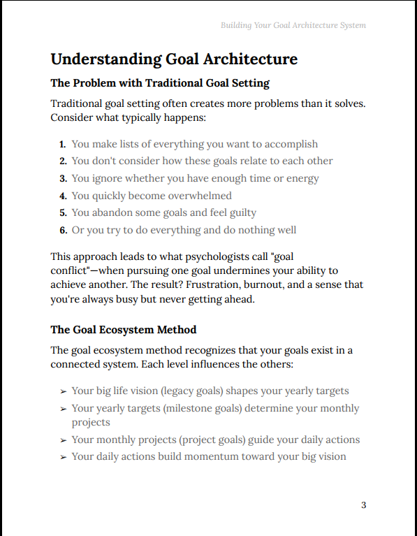 Most people set goals in isolation, leading to confusion, inconsistency, and burnout. Building Your Goal Architecture System Guide solves this by introducing a structured approach where every goal supports another. This reduces friction, increases clarity, and ensures that your effort compounds instead of scattering.