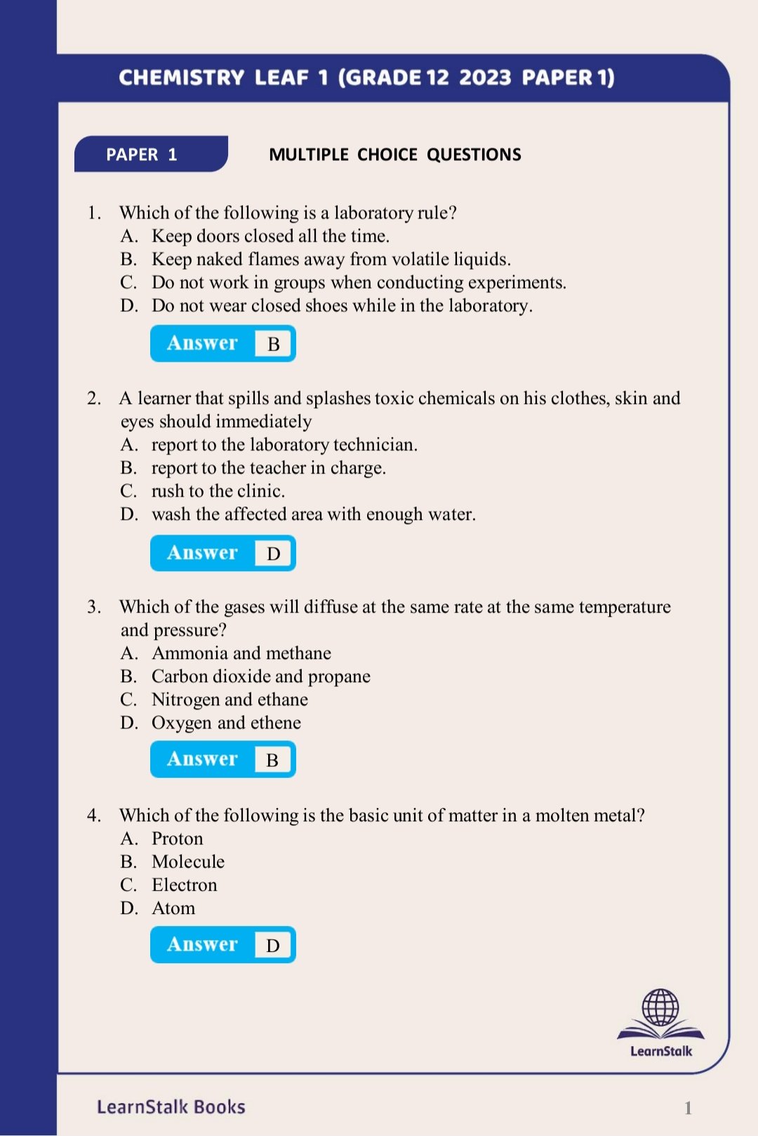 “Chemistry Leaf 1: G12 2023 Paper 1” is a must-have study guide for Grade 12 students preparing for their Chemistry final exams. This ebook includes the full 2023 Paper 1, comprehensive answers, and expert tips to strengthen your understanding of key concepts. Perfect for revision and exam practice, it’s your companion for success in Chemistry.