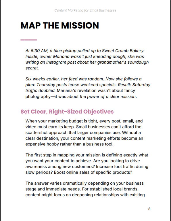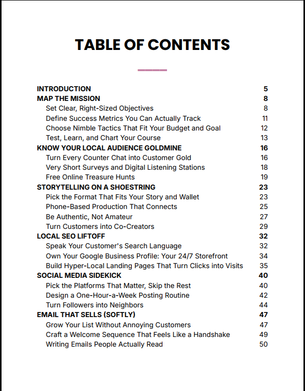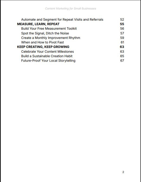 Content Marketing for Small Businesses gives you a complete, actionable system to grow your business using content — without needing a big budget, marketing team, or advanced technical skills. From understanding your local audience to creating simple but powerful content, this guide shows you how to consistently attract customers and turn attention into revenue.