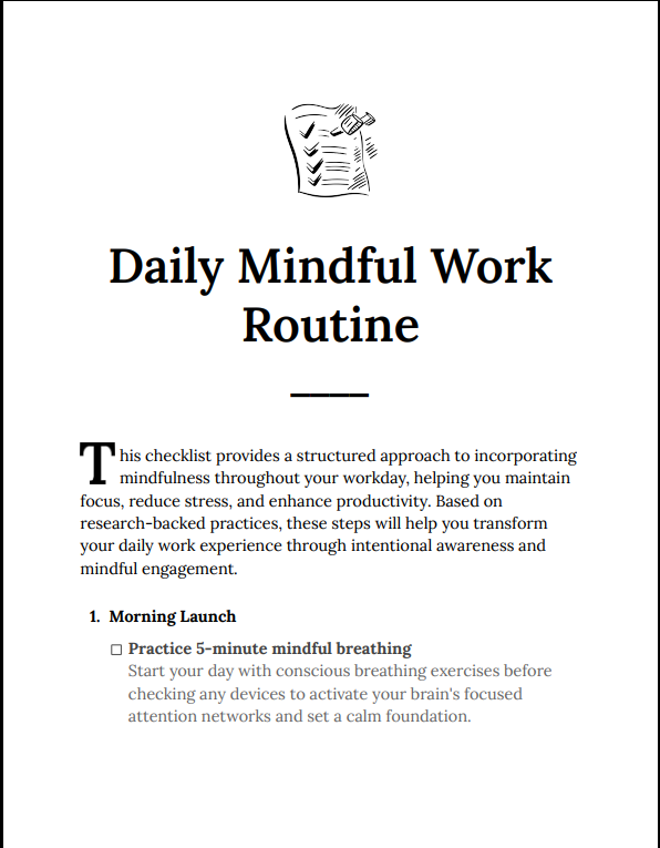 Daily Mindful Work Routine Checklist is a practical, research-backed tool designed to help you stay focused, reduce stress, and work with clarity throughout your day. It guides you step-by-step in integrating mindfulness into your routine so you can improve productivity without burnout.