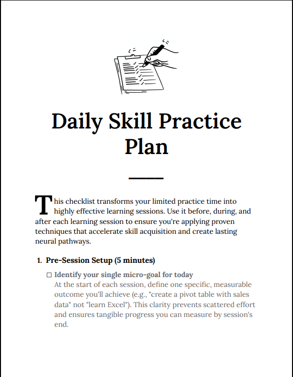 Most people spend time practicing but see slow results because their sessions lack structure and feedback. Daily Skill Practice Plan Checklist solves this by introducing a simple but powerful system — ensuring every session is intentional, focused, and optimized for long-term retention and measurable improvement.