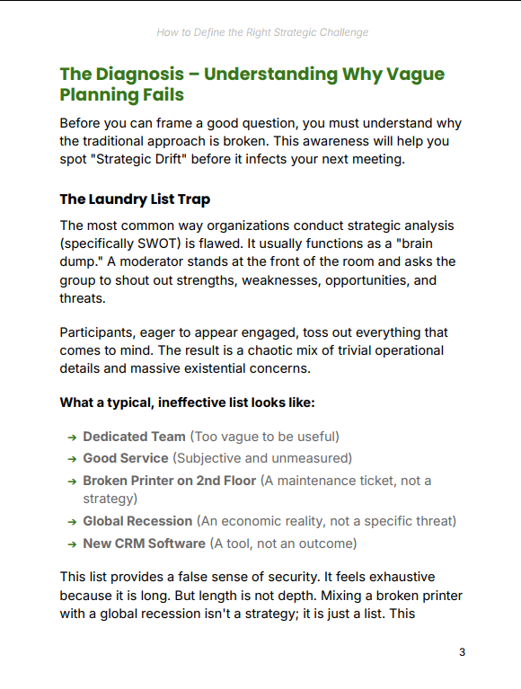 How to Define the Right Strategic Challenge Guide is a practical, decision-focused framework that helps you move from vague strategic discussions to precise, actionable direction. Learn how to frame the right question, eliminate scattered thinking, and build strategies that actually execute in the real world.