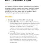 Kill the Robot Voice Checklist is a practical, editor-focused tool that helps you transform flat, AI-generated text into natural, human-sounding writing. It gives you clear, targeted fixes to eliminate robotic patterns, improve flow, and inject personality—so your content feels real, engaging, and credible.