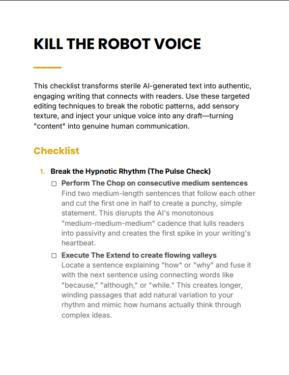 Kill the Robot Voice Checklist is a precision editing tool designed to help you refine AI-assisted or generic writing into authentic, human communication. Instead of rewriting everything from scratch, this checklist shows you exactly what to fix—sentence by sentence—so your content sounds natural, confident, and engaging.
