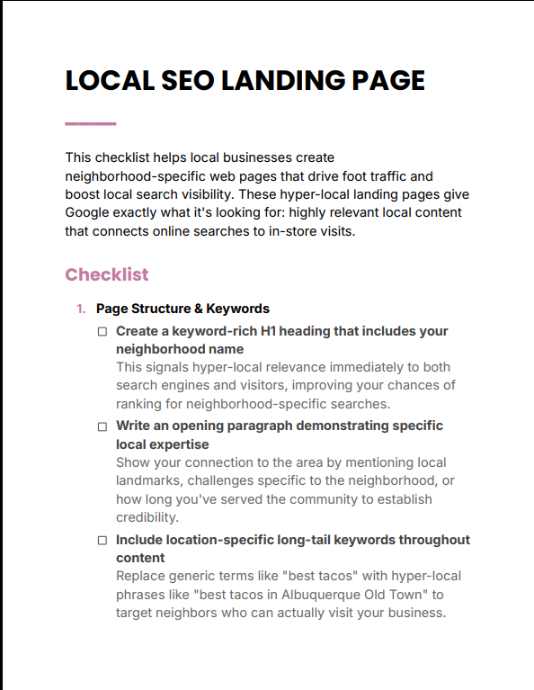 Local SEO Landing Page Checklist gives you a clear, actionable system for building neighborhood-targeted landing pages that rank higher in local search and drive real-world results. Instead of generic SEO advice, this checklist focuses on what actually matters for local visibility — relevance, proximity, and intent — helping you connect online searches directly to in-store visits.