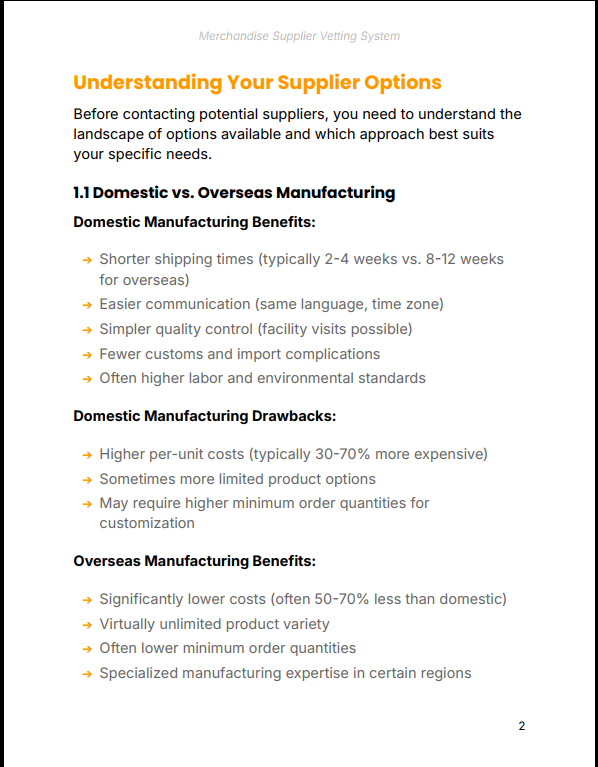 Merchandise Supplier Vetting System Guide gives you a proven system to confidently select and manage suppliers for your merchandise business. Instead of relying on guesswork, this guide walks you through a structured process to identify trustworthy partners, verify quality, negotiate effectively, and build long-term relationships that support consistent growth.
