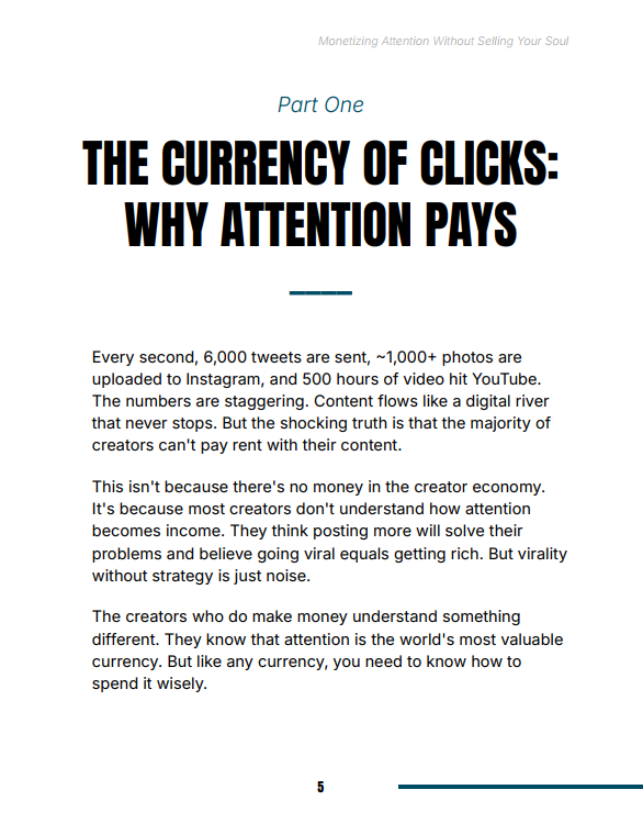 Most people create content but fail to monetize it effectively. Others monetize aggressively and lose trust. Monetizing Attention Without Selling Your Soul solves this by giving you a balanced system—one that aligns attention, trust, and revenue. It eliminates guesswork and replaces it with a repeatable structure you can apply across any platform.