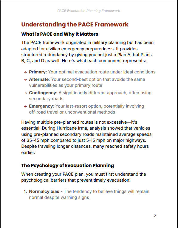 PACE Evacuation Planning Framework Guide provides a structured, real-world approach to emergency evacuation planning using the proven PACE methodology — Primary, Alternate, Contingency, and Emergency. This guide walks you through building layered evacuation strategies that remain functional even when your initial plan fails.