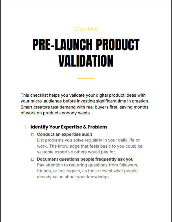 Pre-Launch Product Validation Checklist is a practical, step-by-step framework that helps you test demand, validate ideas, and confirm real buyer interest before building your digital product. Designed for creators, entrepreneurs, and course builders who want to avoid wasted effort and launch with confidence.
