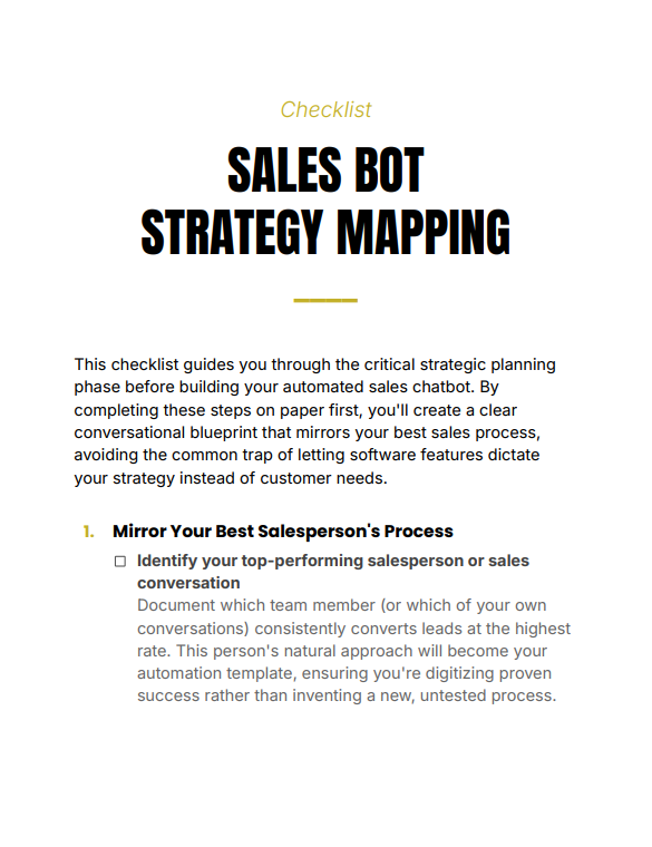 Sales Bot Strategy Mapping Checklist is a practical, pre-build planning tool that helps you design a high-converting chatbot by mapping your sales process before touching any software. It ensures your automation follows customer psychology, not platform limitations—so your bot sells like your best salesperson.
