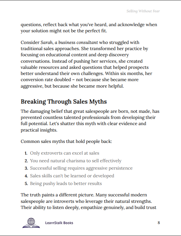 “Selling Without Fear” is a practical guide designed for anyone looking to master the art of selling with confidence. Packed with real-world strategies, mindset shifts, and step-by-step advice, this ebook helps you break through self-doubt, handle objections, and communicate your value with ease. Perfect for entrepreneurs, sales professionals, and small business owners, you’ll discover how to transform your sales approach and close deals fearlessly.