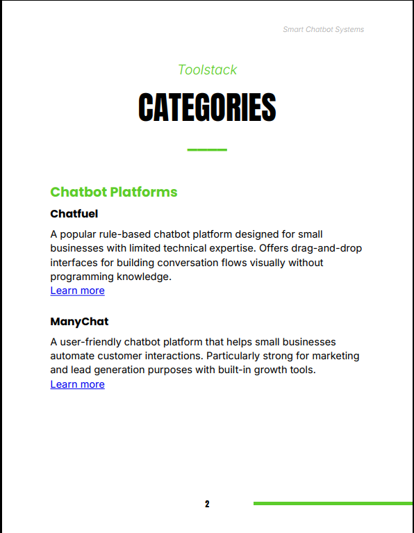 Smart Chatbot Systems Toolstack provides a structured, real-world collection of tools, frameworks, and execution models for building effective chatbot systems. Whether you’re launching your first chatbot or scaling an advanced AI-driven support system, this guide helps you move from scattered tools to a cohesive, high-performing chatbot strategy.