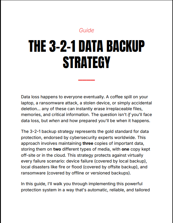 Most people only think about backups after losing something important. The 3-2-1 Data Backup Strategy Guide eliminates that risk by helping you build a system that protects against multiple failure points—hardware damage, human error, cyberattacks, and disasters—before they happen.