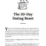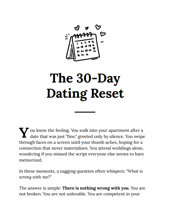 The 30-Day Dating Reset Guide is a practical, psychology-driven roadmap that helps you reset your dating life by replacing guesswork with strategy. It challenges the myth that love is purely luck and equips you with a clear system to attract, evaluate, and build meaningful connections. Through structured daily actions and mindset shifts, you’ll move from hoping to be chosen to confidently choosing what’s right for you.