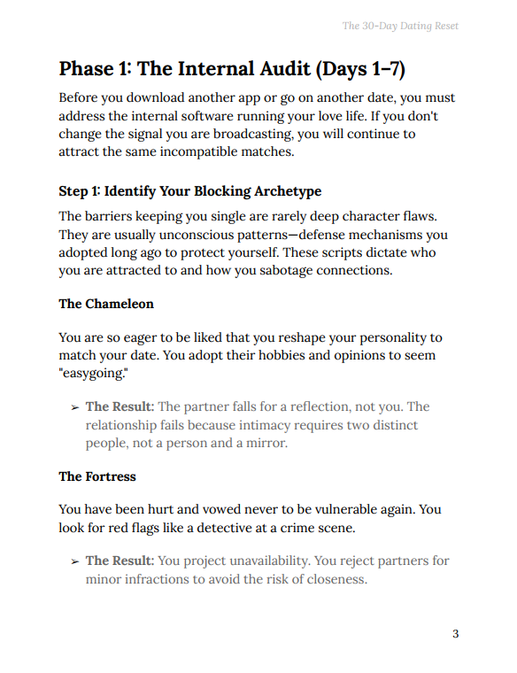 Many people stay stuck in dating cycles not because they lack value, but because they lack a system. The 30-Day Dating Reset Guide replaces uncertainty with clarity by giving you a repeatable framework. It reduces emotional confusion, eliminates passive waiting, and helps you take control of your dating outcomes through intentional action.