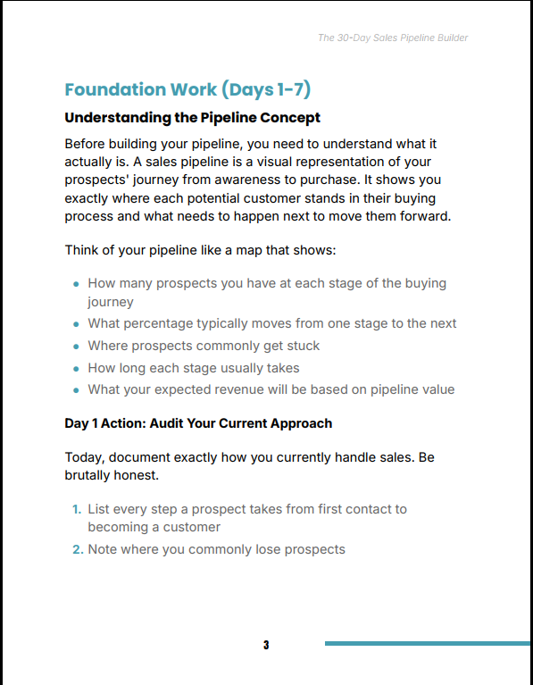 The 30-Day Sales Pipeline Builder Guide gives you a clear, structured system to escape the feast-or-famine cycle and build a predictable client acquisition engine. Instead of relying on inconsistent effort or luck, this guide helps you design a measurable, repeatable pipeline that tracks prospects from first contact to conversion. In just 30 days, you’ll move from uncertainty to control—with visibility into where your next client is coming from.