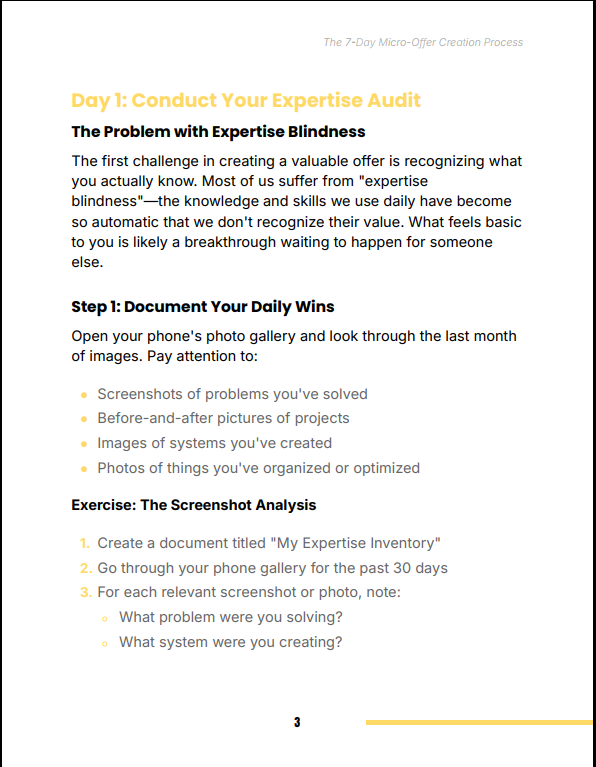 The 7-Day Micro-Offer Creation Process Guide walks you through a clear, execution-focused system to transform your existing skills into a profitable digital product in just seven days. Instead of building large, time-consuming courses, this guide teaches you how to create a simple, targeted “micro-offer” that solves one specific problem your audience is willing to pay for.