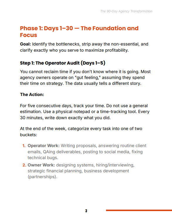 The 90-Day Agency Transformation Guide is a practical, execution-focused roadmap for agency owners trapped in day-to-day operations. Instead of relying on hustle, this guide introduces a systems-first approach that restructures your business for scale, efficiency, and freedom. Over 90 days, you will replace chaos with clarity, delegation with accountability, and effort with leverage.
