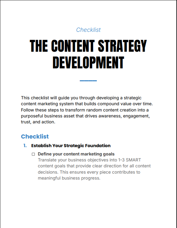 The Content Strategy Development Checklist gives you a clear, structured process to design a content system that works — not just for today, but long-term. Instead of guessing what to post, you’ll define your message, audience, and content engine so every piece you create contributes to growth, authority, and conversions.