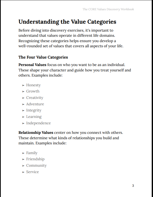 Many people make decisions based on pressure, habit, or convenience—leading to misalignment and dissatisfaction. The CORE Values Discovery Workbook helps you remove that confusion by giving you a clear, structured system to identify what truly matters, so every decision becomes more intentional and aligned.