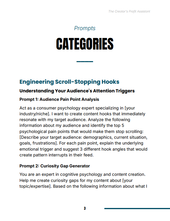 The Creator’s Profit Assistant Prompts gives you a structured, AI-powered system to transform your content into a revenue engine. Instead of guessing what works, you’ll use proven prompt frameworks built around the three pillars of successful creators: attention, trust, and monetization. Whether you’re growing a small audience or scaling an established brand, this guide helps you produce content that converts consistently.
