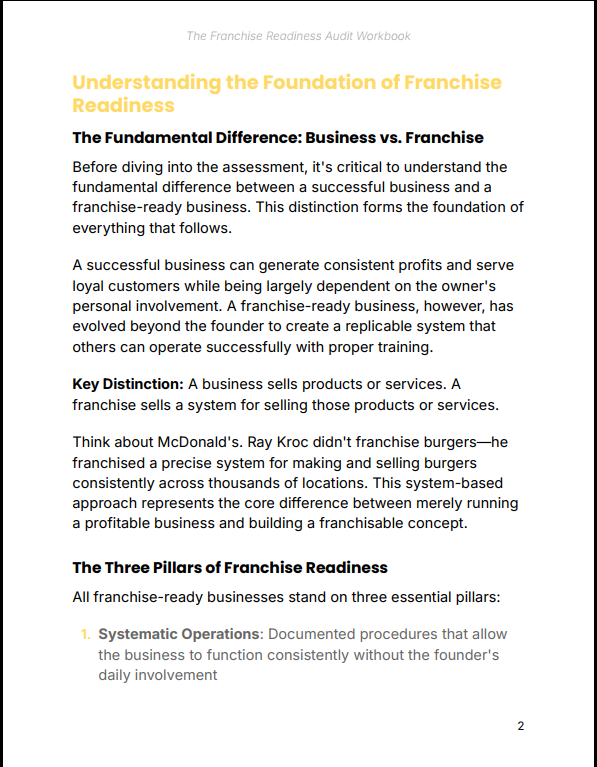 The Franchise Readiness Audit Workbook is a structured, decision-making tool designed to help business owners evaluate whether franchising is the right growth strategy. Rather than guessing or rushing into expansion, this workbook walks you through a systematic 12-criteria audit covering profitability, systems, brand strength, and operational consistency—so you can make a clear, informed decision.