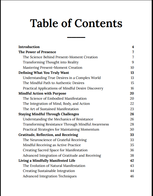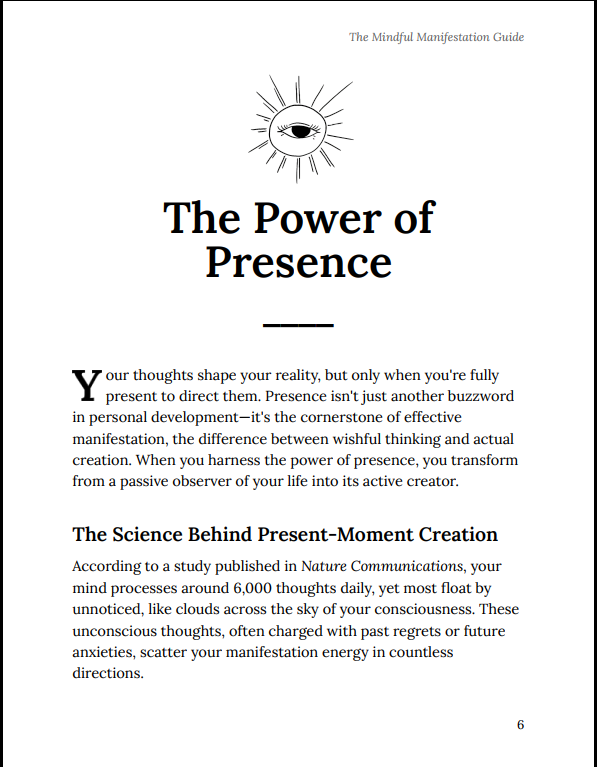 The Mindful Manifestation Guide is a grounded, science-informed approach to manifestation that replaces vague thinking with clarity, presence, and aligned action. Learn how to use awareness, intention, and consistent practice to turn thoughts into measurable outcomes in your life, work, and personal growth.