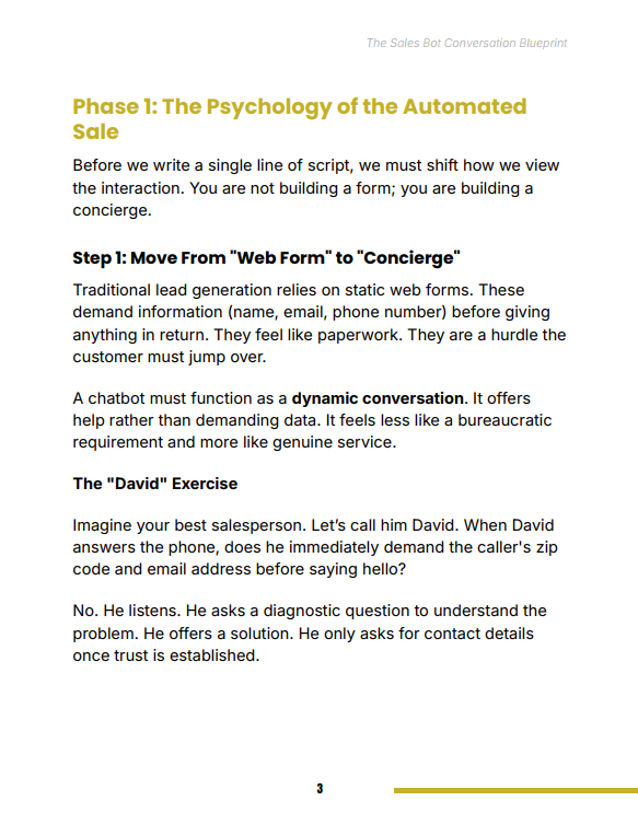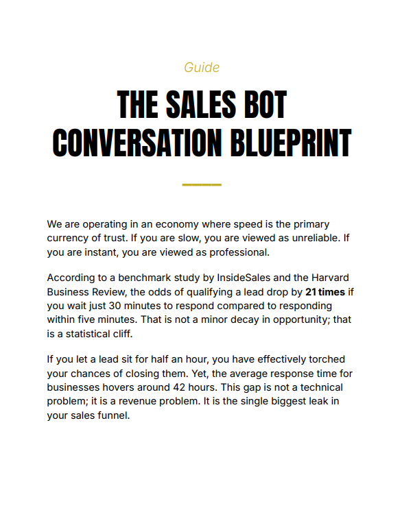 The Sales Bot Conversation Blueprint Guide is a high-impact, practical framework that teaches you how to design automated sales conversations that convert — before you ever touch chatbot software. Built on real sales psychology and response-time economics, this guide shows you how to eliminate delays, capture leads instantly, and create a 24/7 automated sales system.