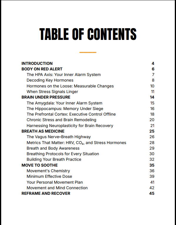 - Step-by-step breathing protocols for real-time stress control