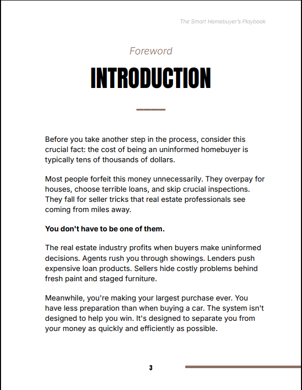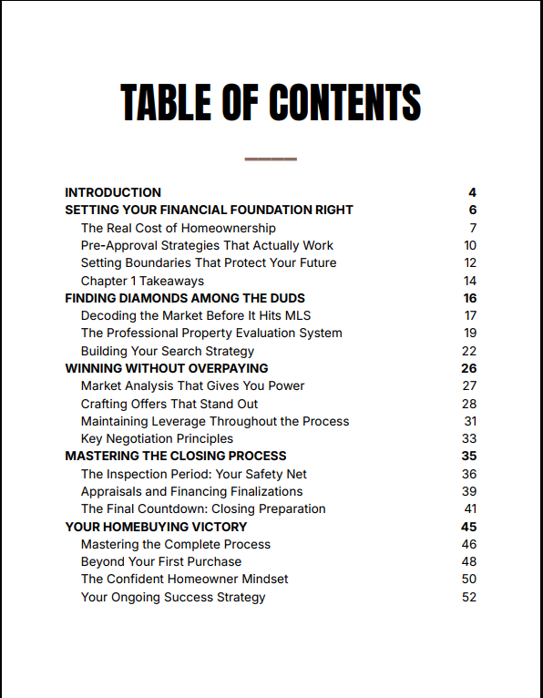 Buying a home is one of the biggest financial decisions you’ll ever make, yet most buyers rely on guesswork or incomplete advice. The Smart Homebuyer’s Playbook gives you a structured system—helping you analyze deals, avoid emotional decisions, and maintain negotiation power from start to finish.