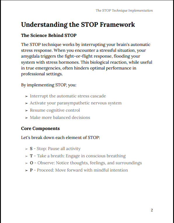 The STOP Technique Implementation Guide is a practical, science-backed framework that helps you manage stress in real time, regain control under pressure, and respond with clarity instead of reaction. Designed for professionals in fast-paced environments, this guide turns everyday stress triggers into moments of awareness, focus, and better decision-making.