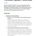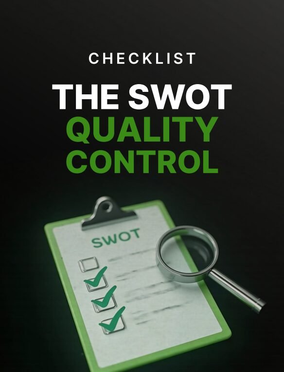 The SWOT Quality Control Checklist is built to solve a common but costly problem: SWOT analyses that look complete but fail to produce real strategy. This checklist gives you a structured way to audit your SWOT process, identify critical weaknesses, and refine your outputs into focused, decision-ready insights.