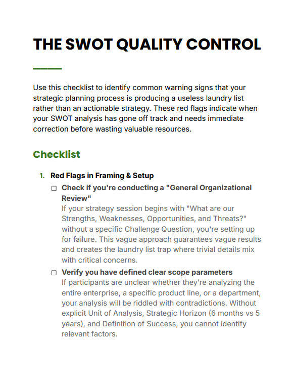 The SWOT Quality Control Checklist is a precision tool designed to audit and fix weak SWOT analyses before they turn into ineffective, generic strategies. It helps you identify critical red flags, eliminate noise, and transform your strategic planning into clear, actionable decisions.