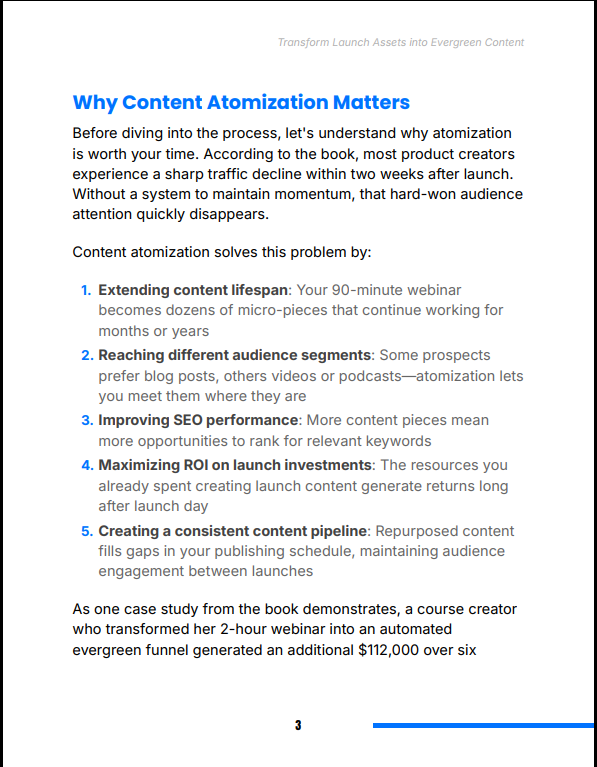 Transform Launch Assets into Evergreen Content Guide shows you how to convert your completed product launches into long-term growth systems. Instead of constantly creating new content, this guide teaches you how to extract, restructure, and redistribute your existing assets into a scalable evergreen content engine. Ideal for creators, entrepreneurs, and digital marketers who want to maximize ROI on every launch.